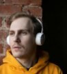 A person is cleaning a glass surface on a modern building using a squeegee. They stand on a narrow ledge with a safety harness attached. Another person is on an escalator inside the building, partially visible through the glass.